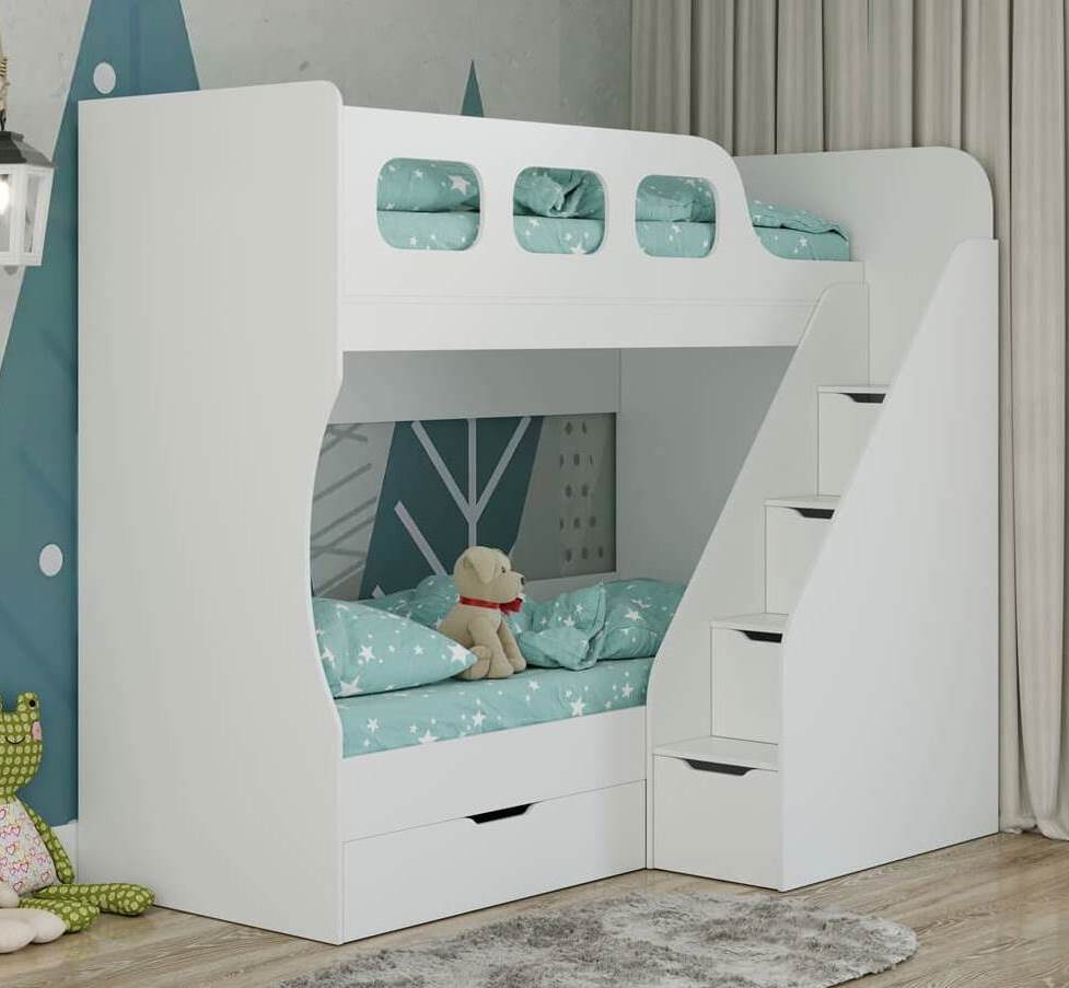 - Модели с лестницей-ящиками. Функциональная лестница с выдвижными ящиками не только обеспечивает безопасный подъем на верхний ярус, но и помогает хранить вещи, игрушки или постельное белье.