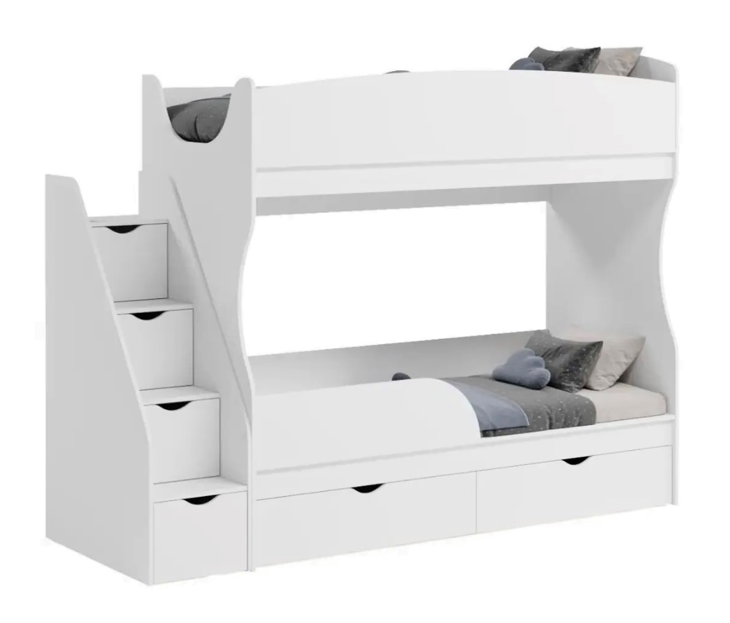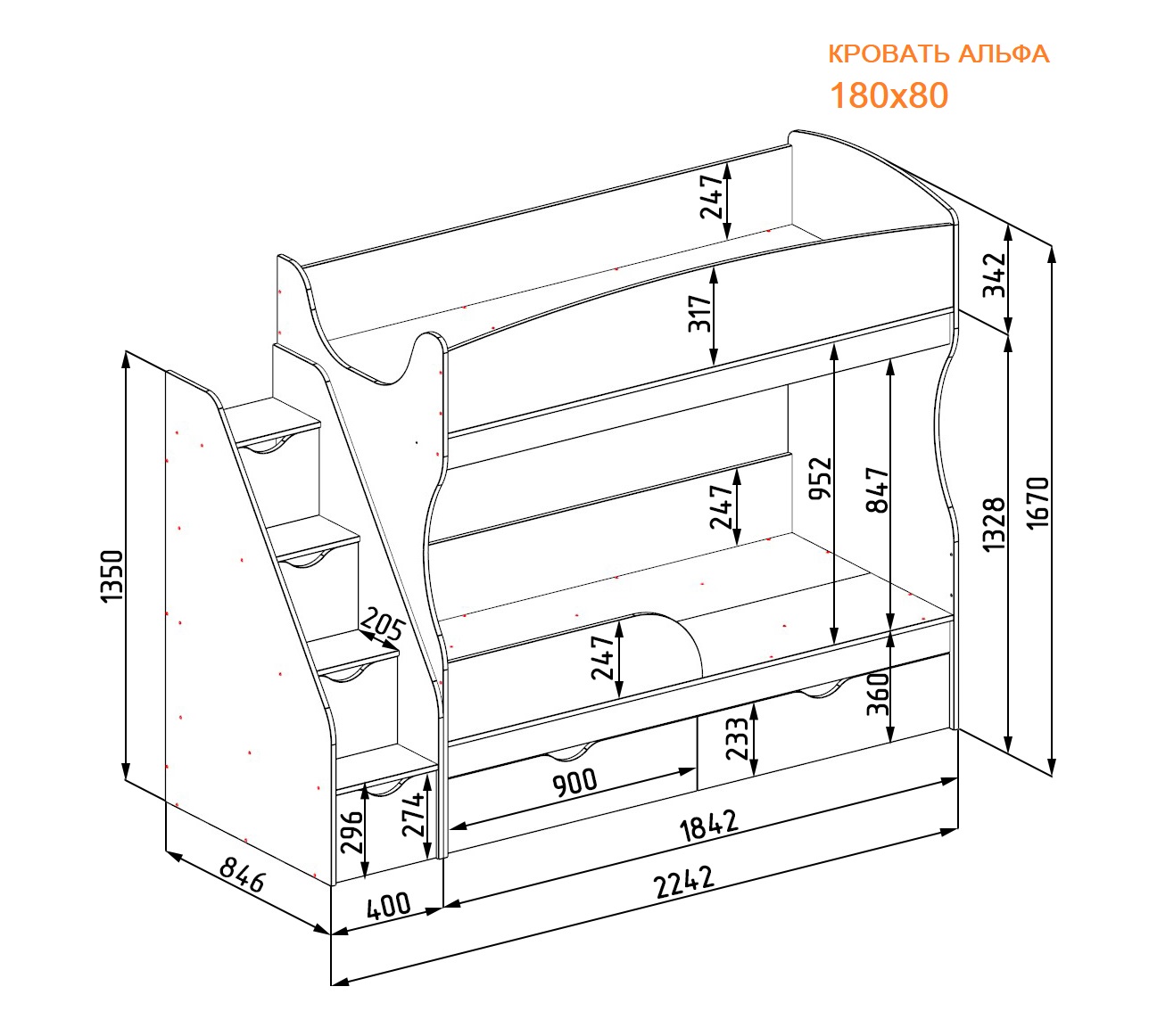 Кровать двухъярусная Альфа с удобной лестницей, ящиками и нижним бортиком.