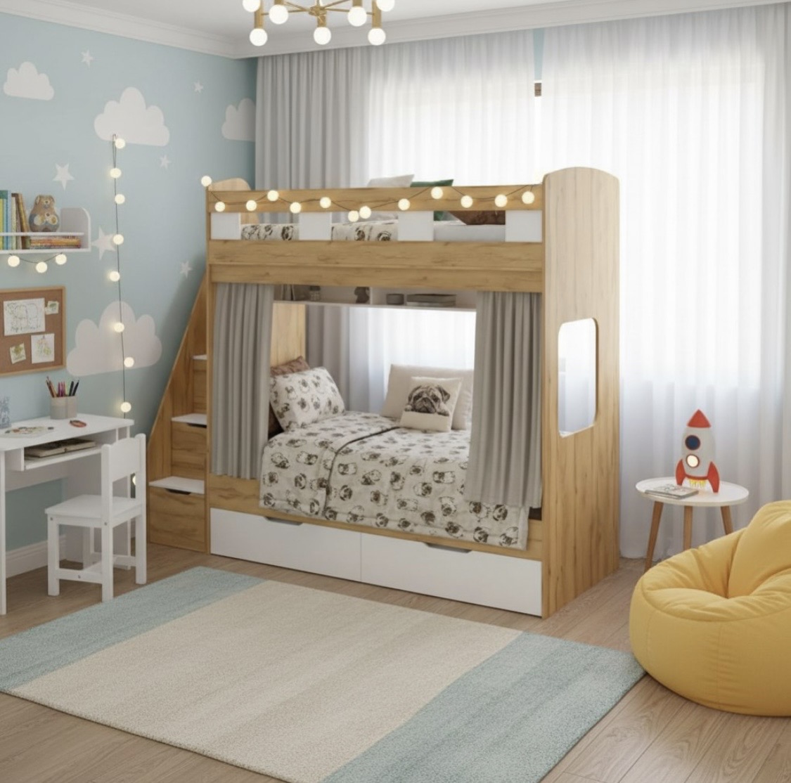 спальное место для двоих, навесная полка для книг и игрушек, вместительные выдвижные ящики под кроватью, а также безопасная лестница расположенная сбоку, обеспечивающая быстрый и удобный доступ на второй этаж, с безопасными ступенями в виде выдвижных ящиков.