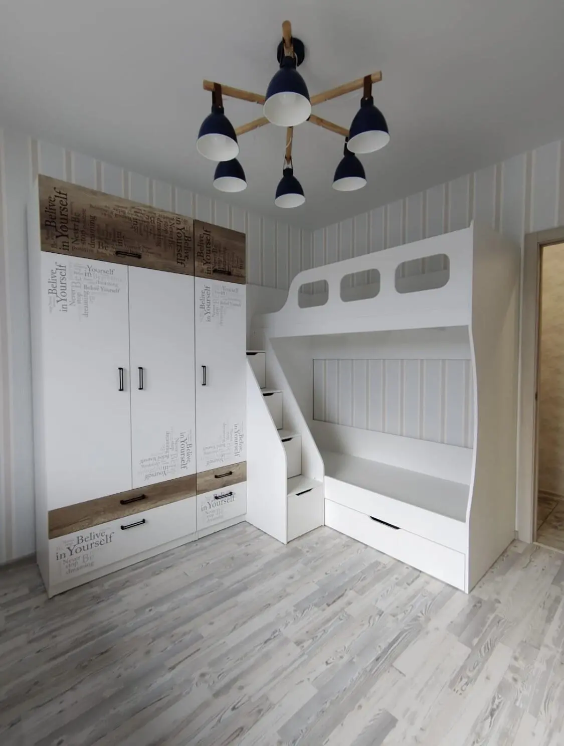 * В нижнюю кровать встроен выдвижной ящик для белья и игрушек.