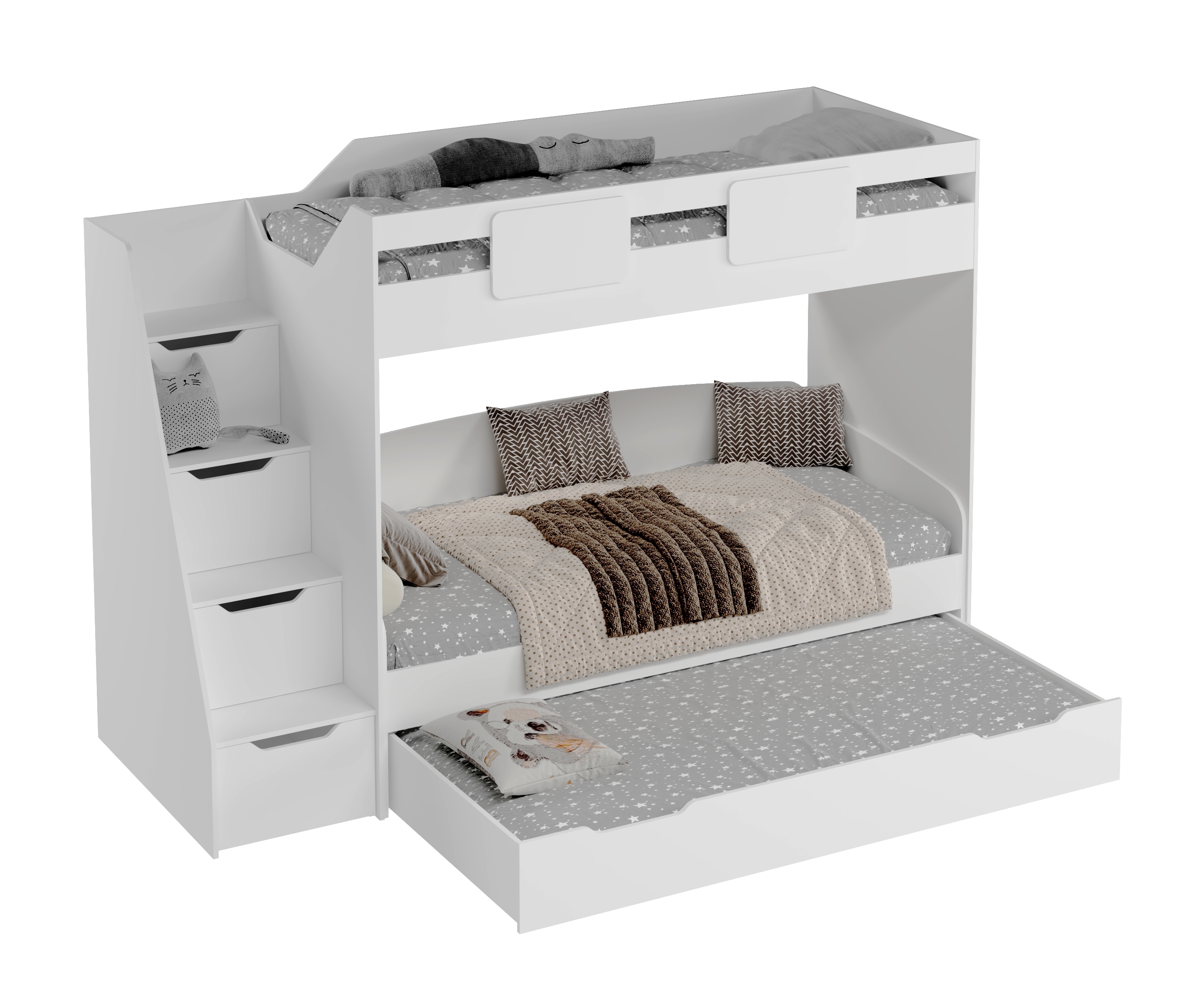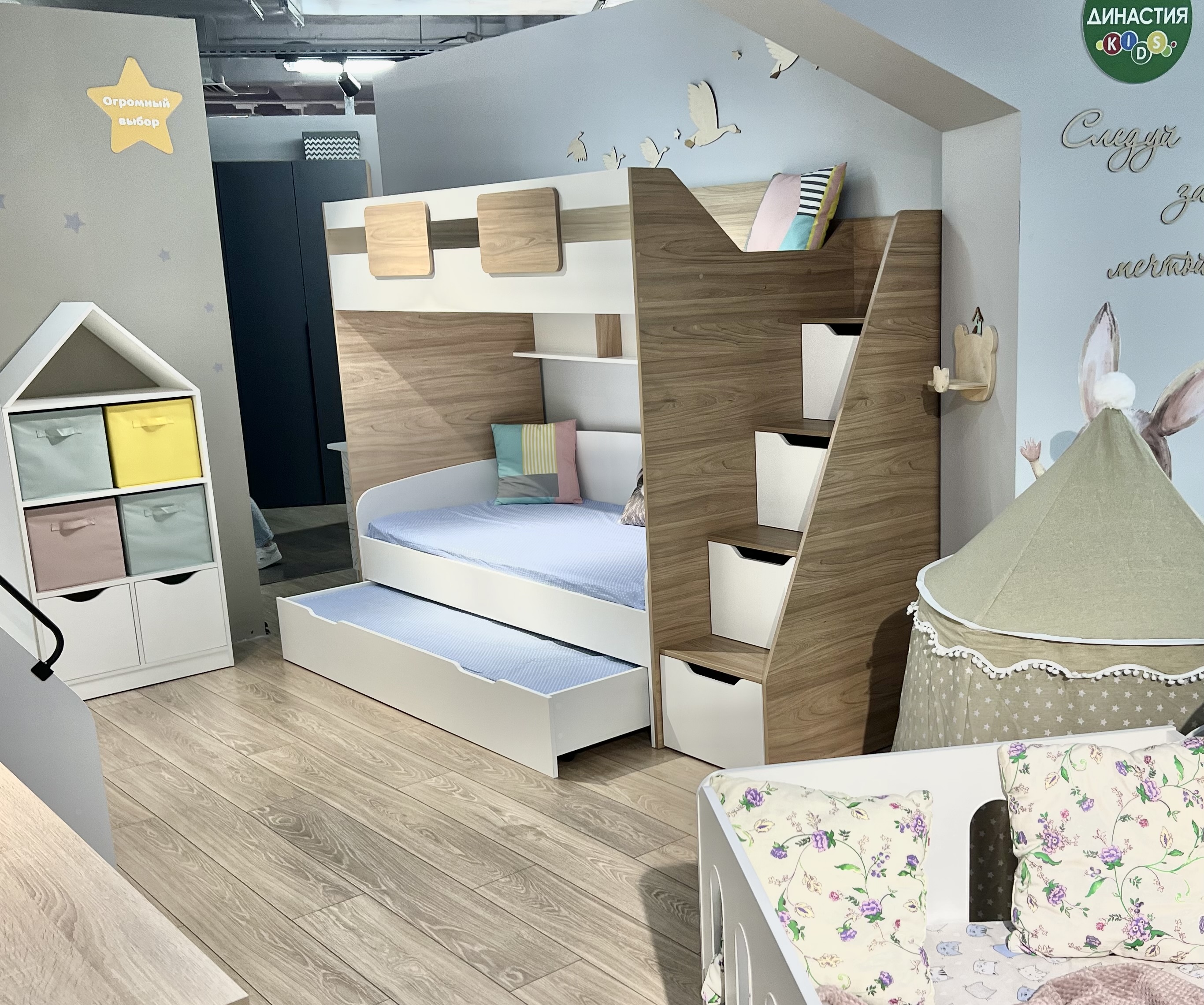 В лестницу встроены выдвижные ящики для игрушек - удобно и практично.
