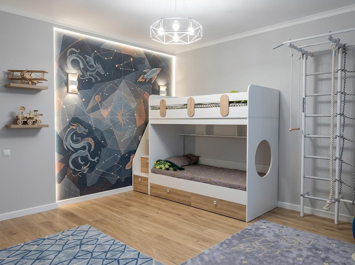 Два выдвижных ящика нижней кровати с прочным дном из ЛДСП 16 мм (не ДВП, не ХДФ!) выдерживают нагрузку до 45 кг.
