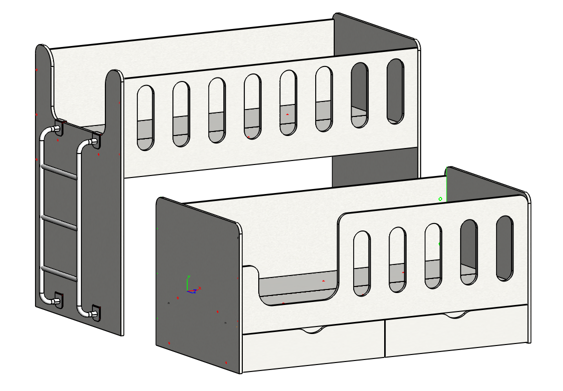 В нижнюю кровать встроены два ящика на шариковых направляющих.