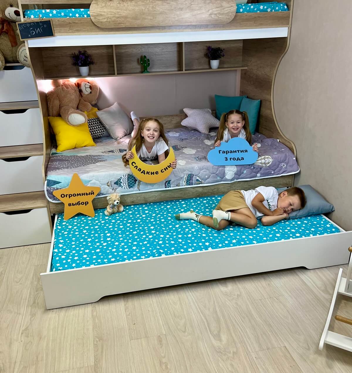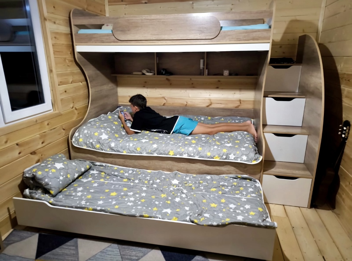 Увеличенное, просторное нижнее спальное место позволяет комфортно разместиться ребенку вместе со взрослым.