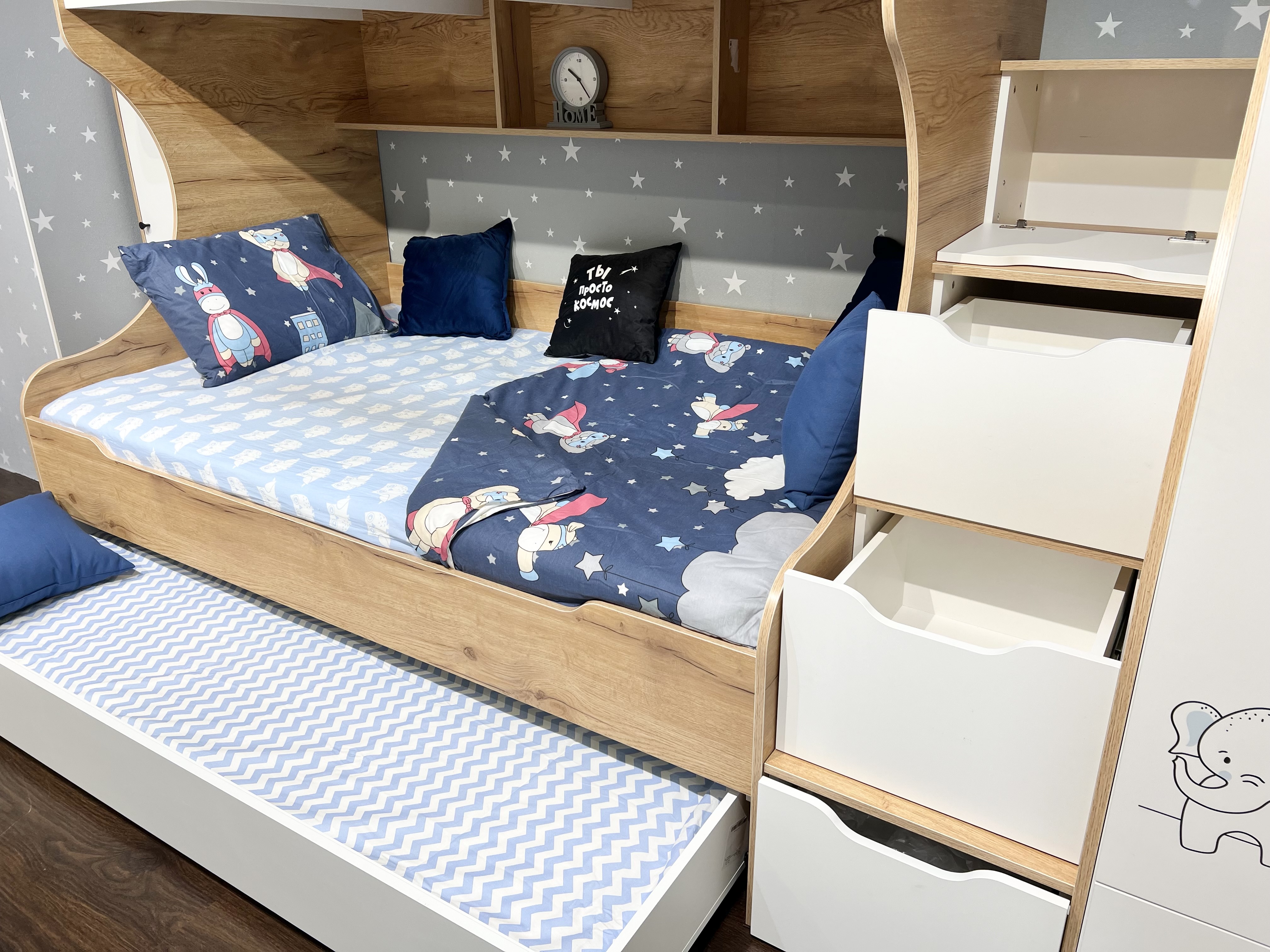 Увеличенное, просторное нижнее спальное место позволяет комфортно разместиться ребенку вместе со взрослым.