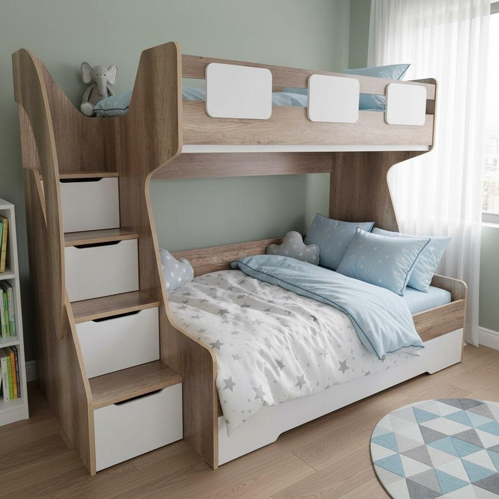 Увеличенное, просторное нижнее спальное место позволяет комфортно разместиться ребенку вместе со взрослым.