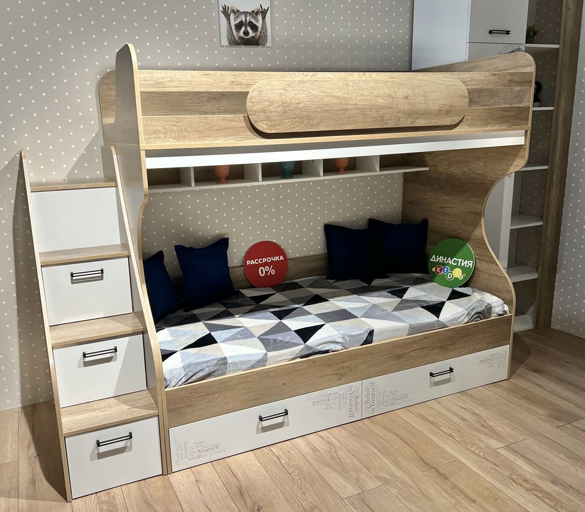 Кровать уникальна наличием лестницы-комода, в которой можно хранить как постельное белье, так и детские игрушки.