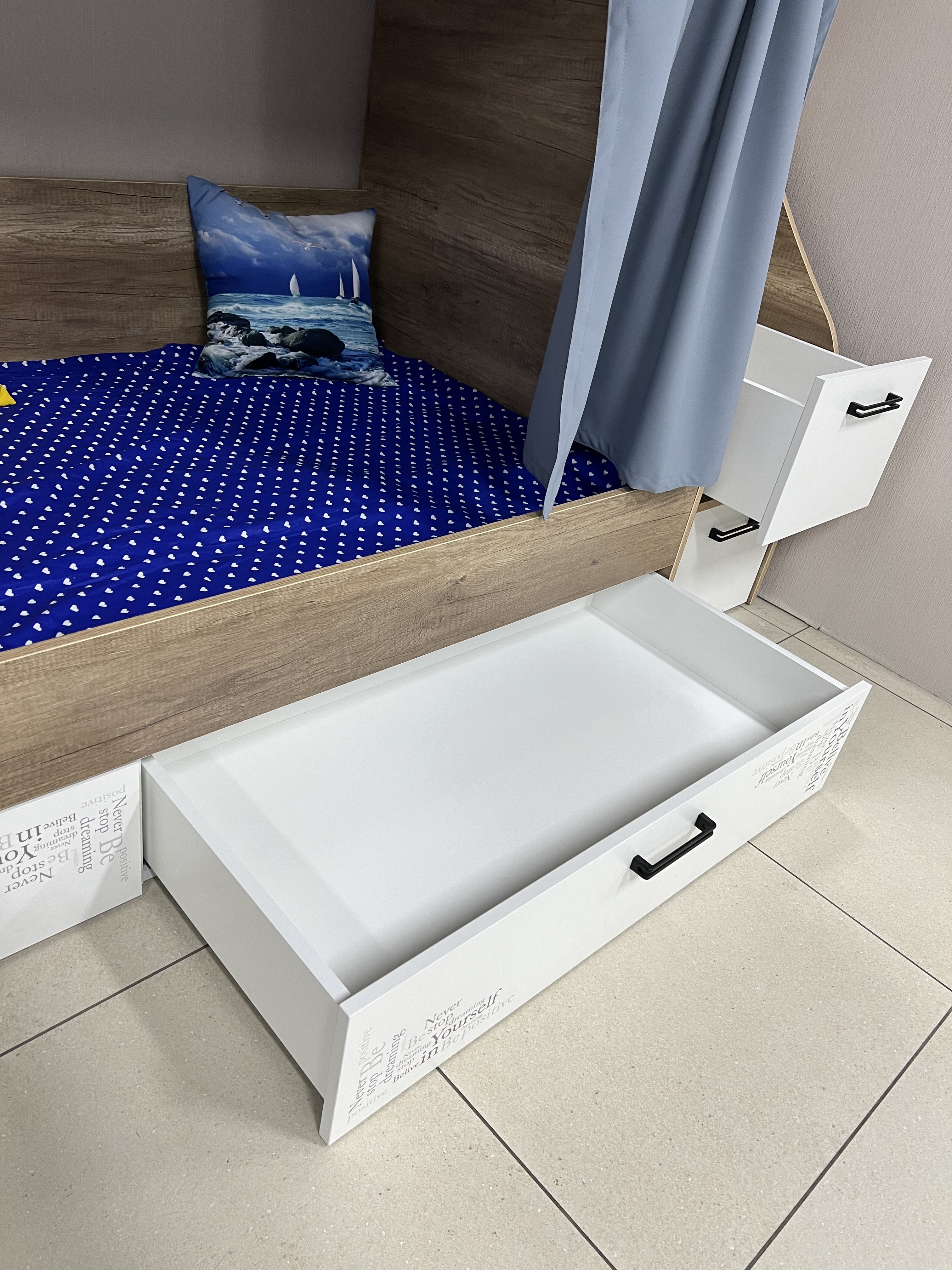 * Выдвижные ящики в нижней кровати на направляющих скрытого монтажа с доводчиками