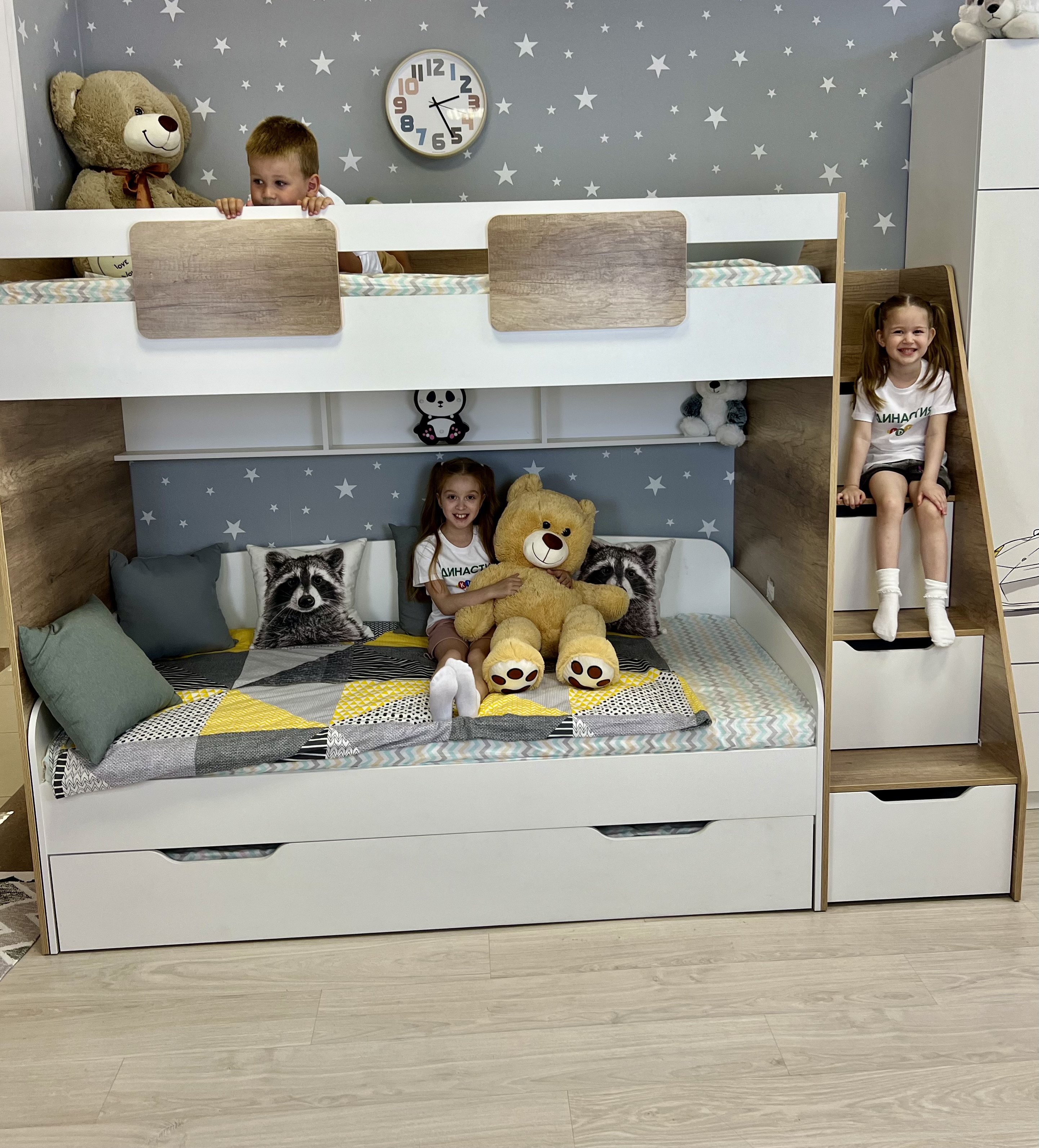 В лестницу встроены ящики для игрушек - удобно и практично.