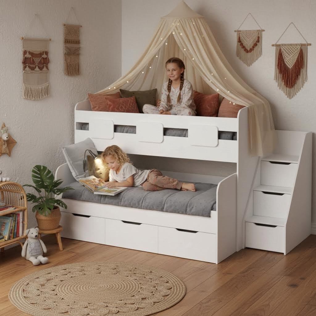 - Невысокая конструкция кровати обеспечивает удобный доступ на второй этаж, делая её идеальной даже для самых маленьких детей.