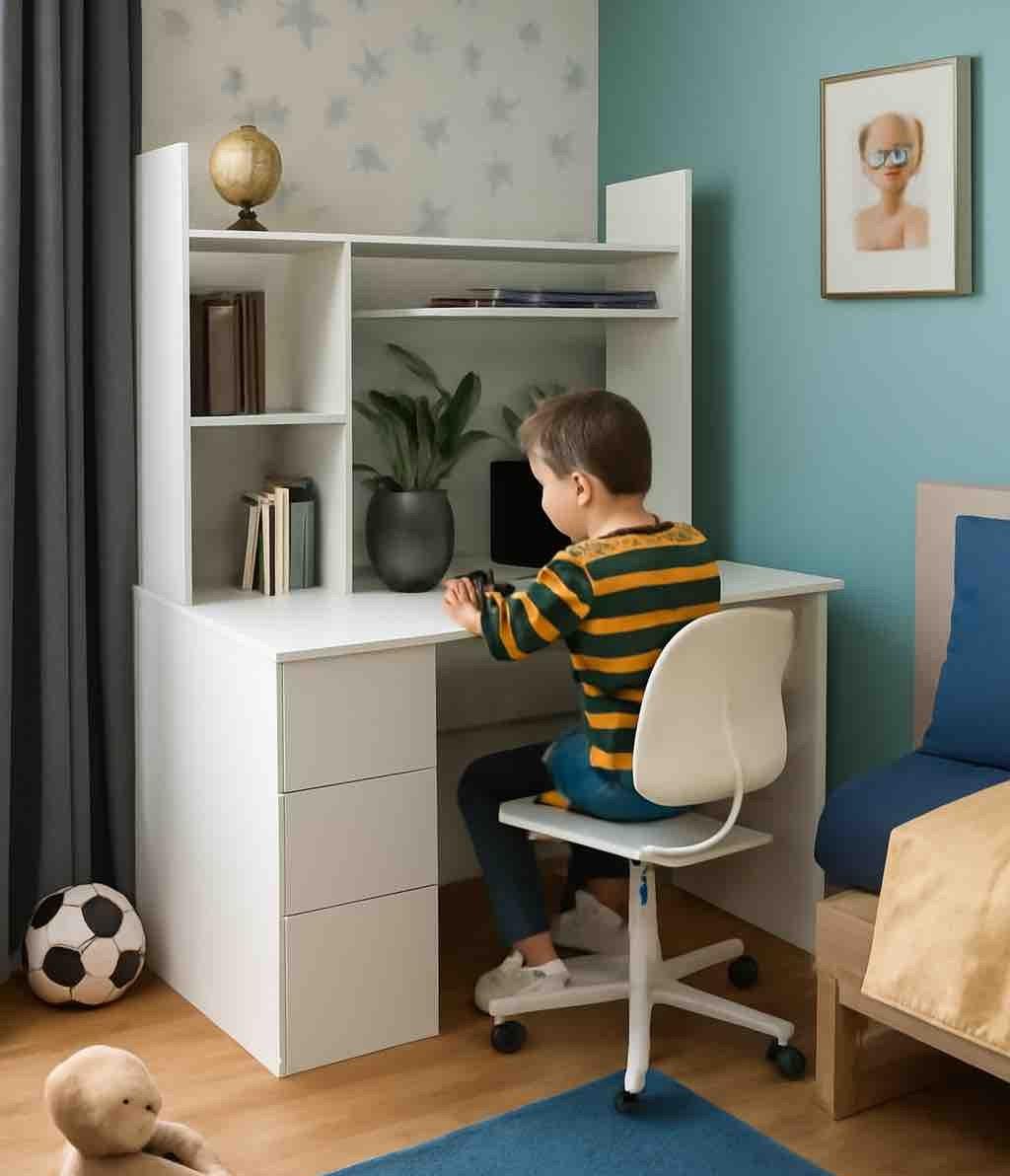 Практичный и удобный стол займет немного места в комнате и в тоже время позволит разместить учебники, любимые книги и игрушки.