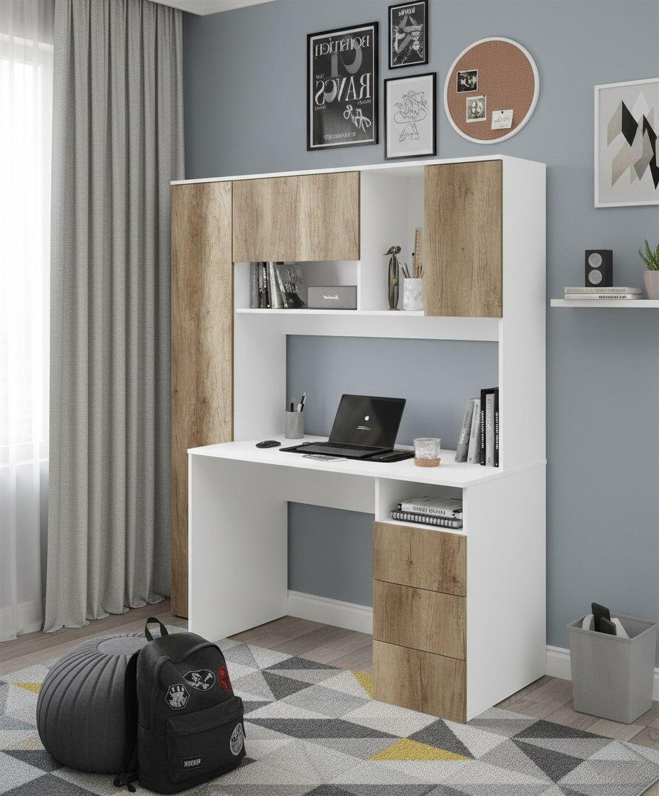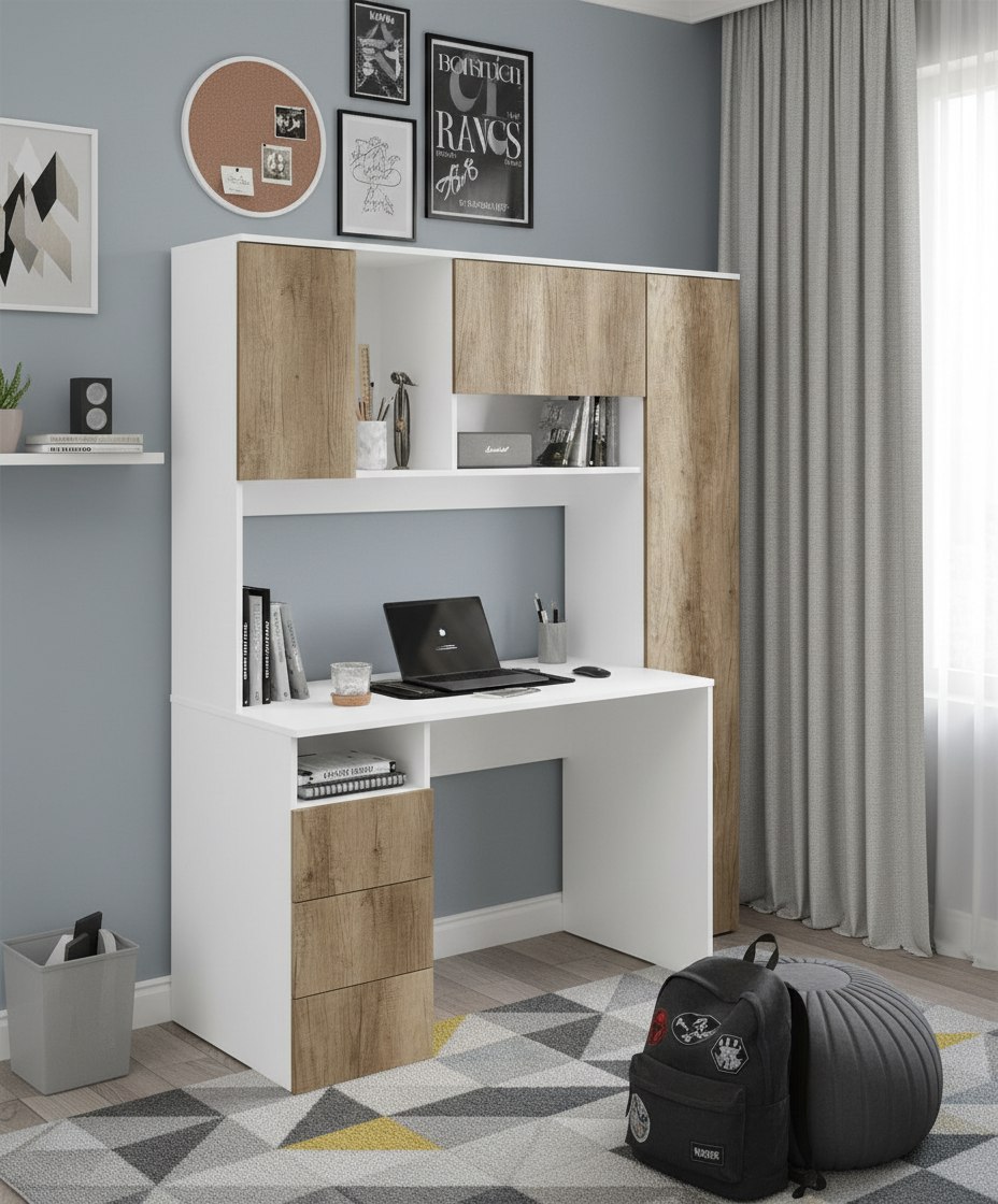 Просторная поверхность, удобные полки и ящики позволят разместить учебники, книги и канцелярию.