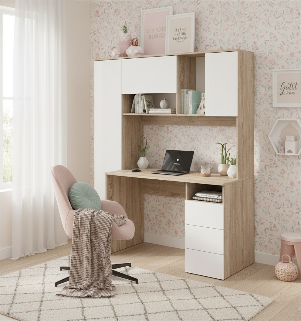 Просторная поверхность, удобные полки и ящики позволят разместить учебники, книги и канцелярию.