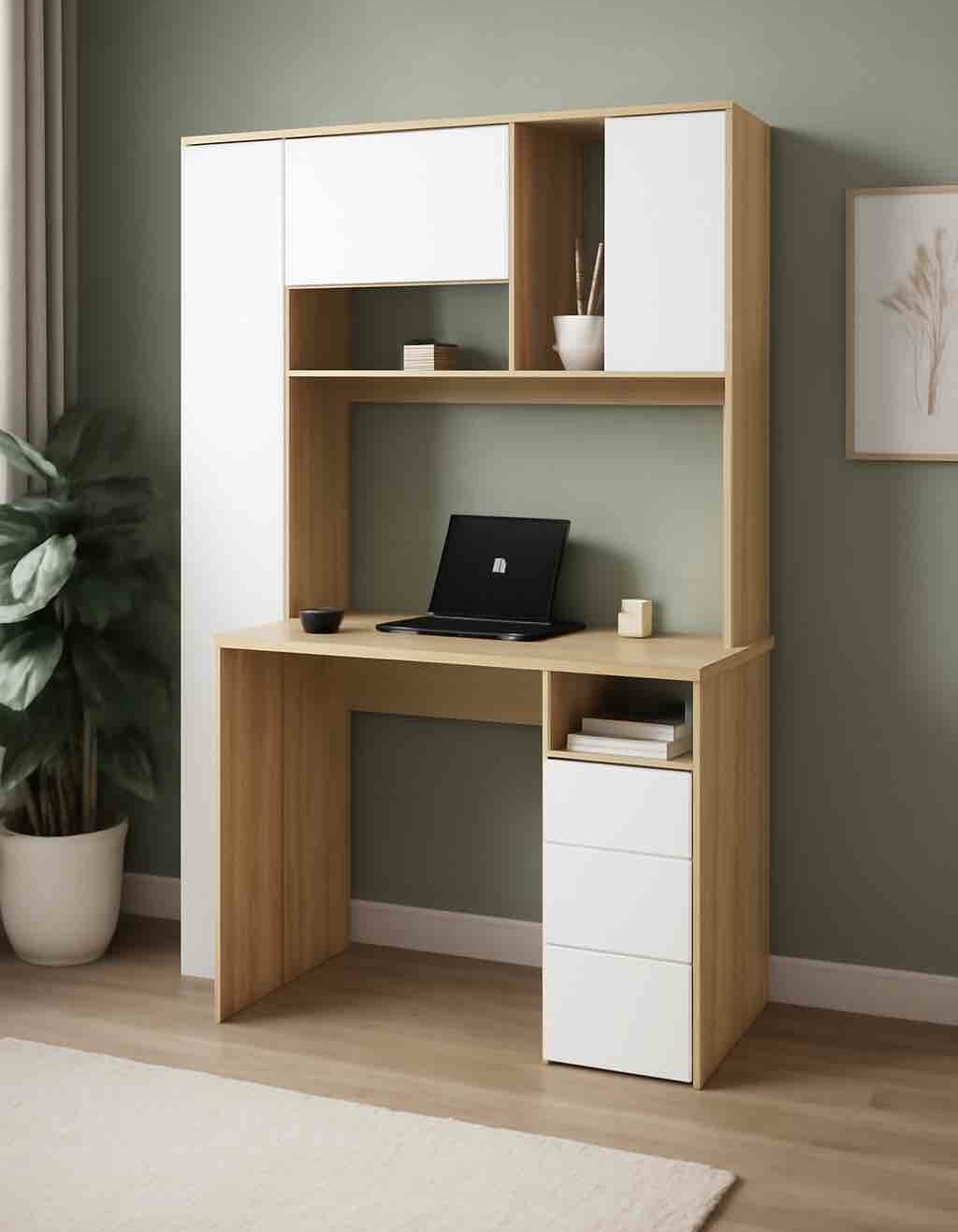 Просторная поверхность, удобные полки и ящики позволят разместить учебники, книги и канцелярию.