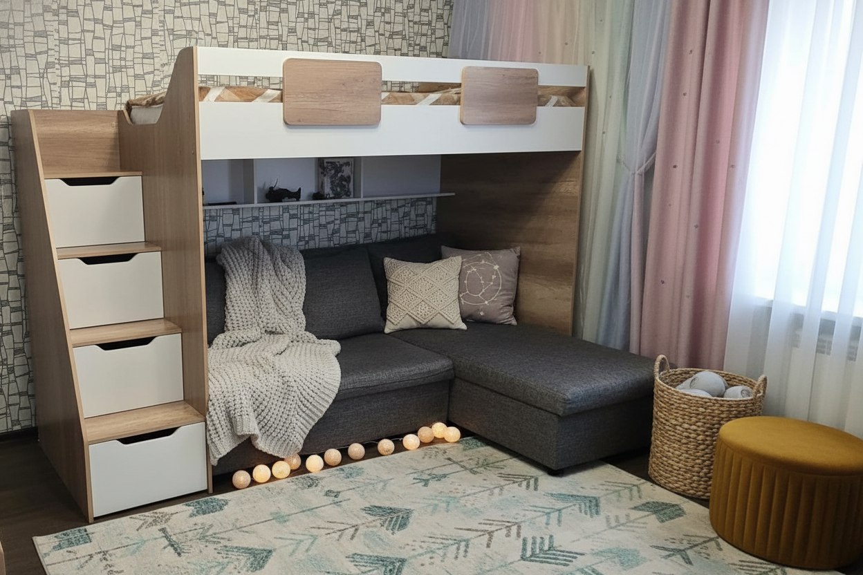Вместо них - цельный и прочный настил из ЛДСП, который выдерживает сверхвысокую нагрузку и позволяет расположиться даже взрослому с ребенком.