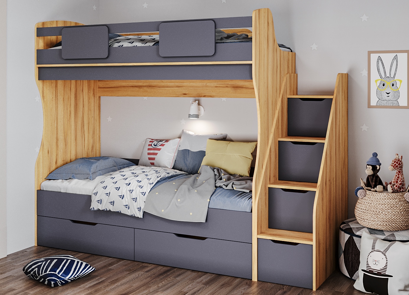 Кровать имеет также два выдвижных ящика для хранения белья или игрушек с доводчиками.