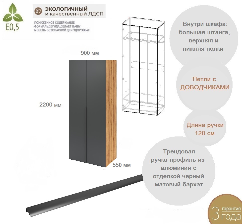 Мебель выполнена из сертифицированного, качественного, экологически чистого ЛДСП класса Е0,5 в популярных расцветках дуб золотистый + графит.