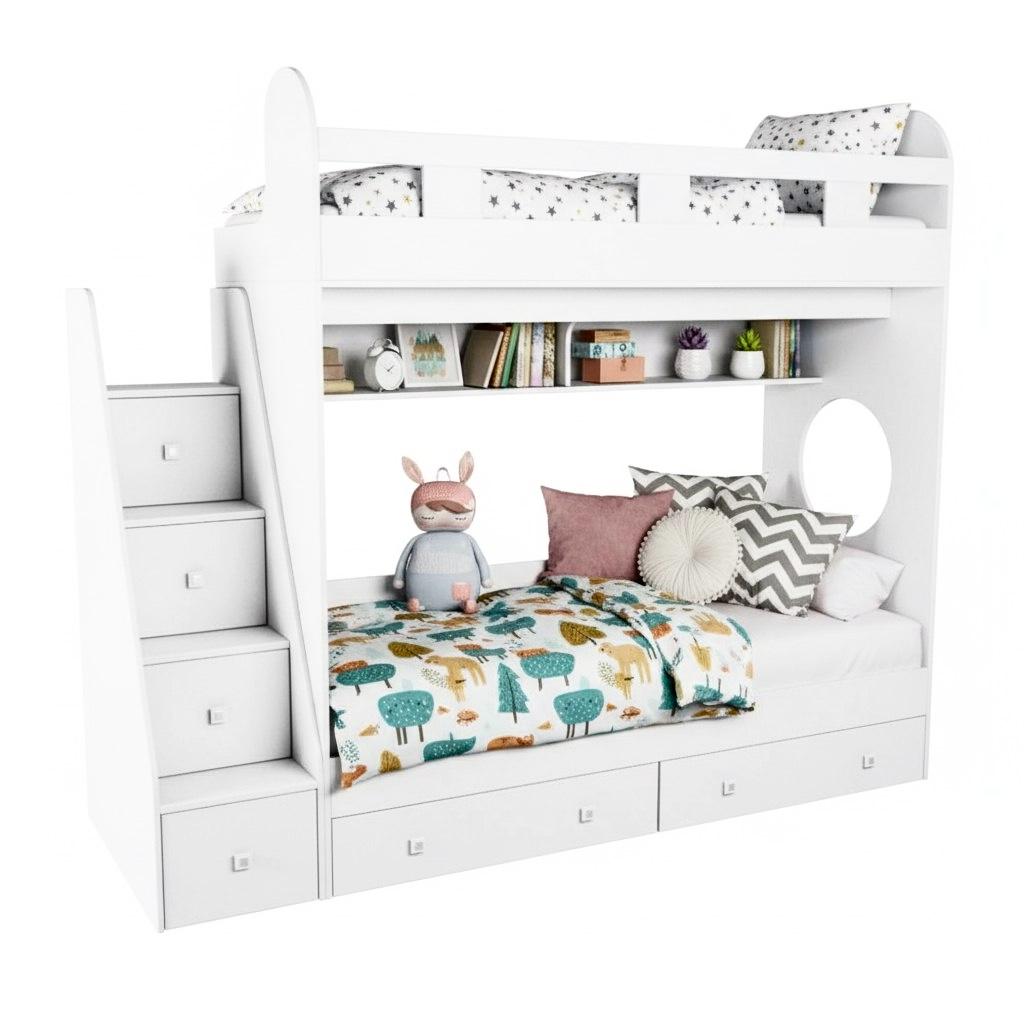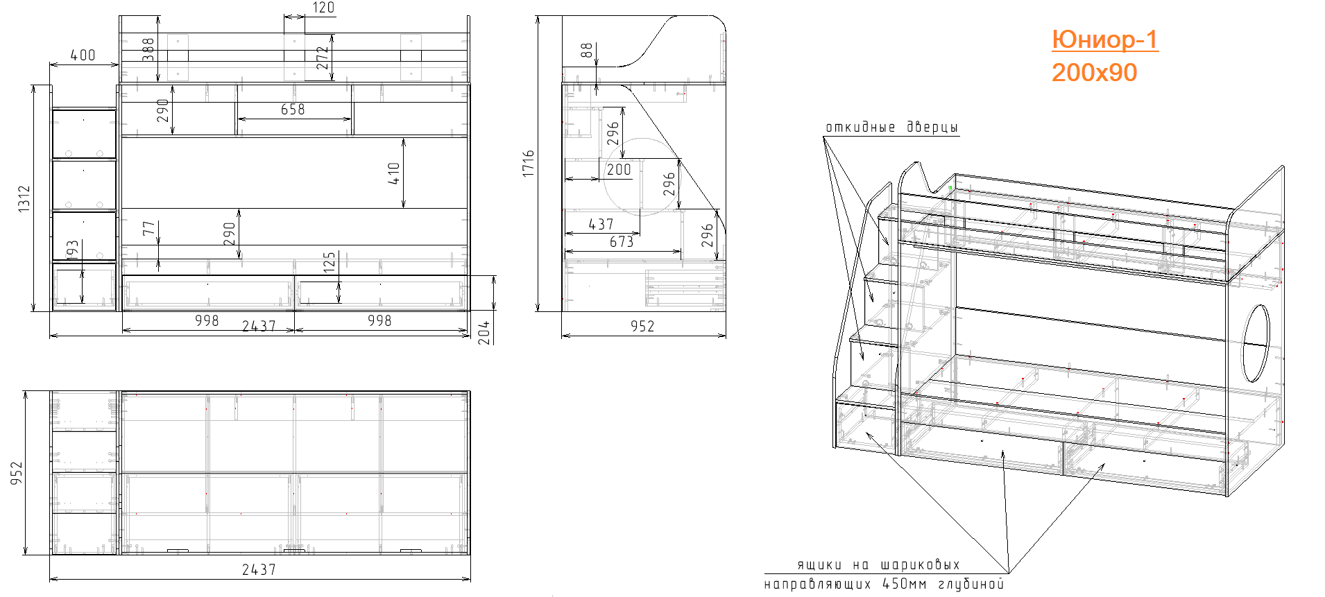 В лестницу встроены ящики для игрушек (нижний ящик на шариковых направляющих, остальные ящики имеют откидные фасады).