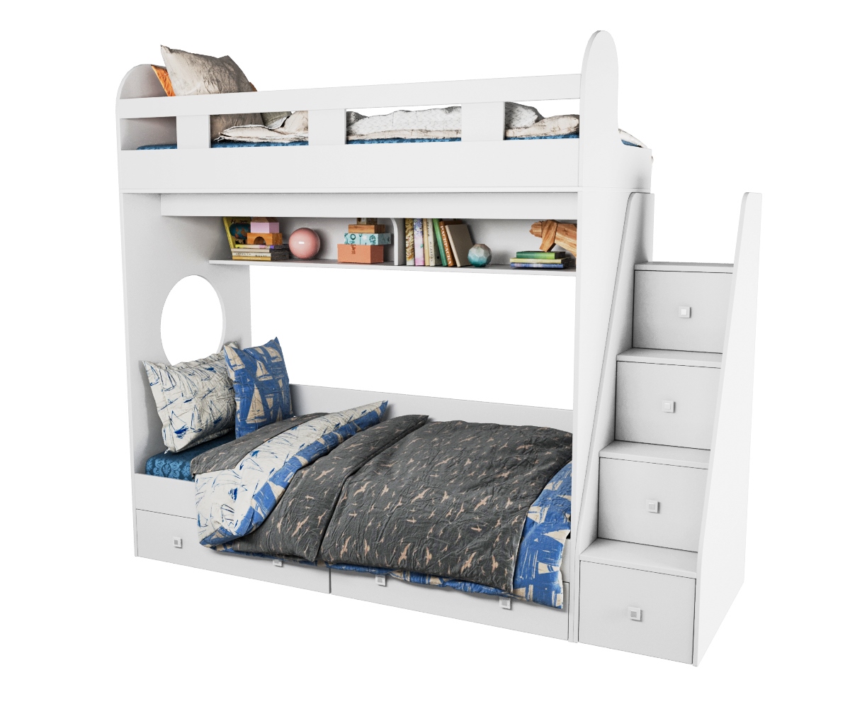 В лестницу встроены ящики для игрушек (нижний ящик на шариковых направляющих, остальные ящики имеют откидные фасады).