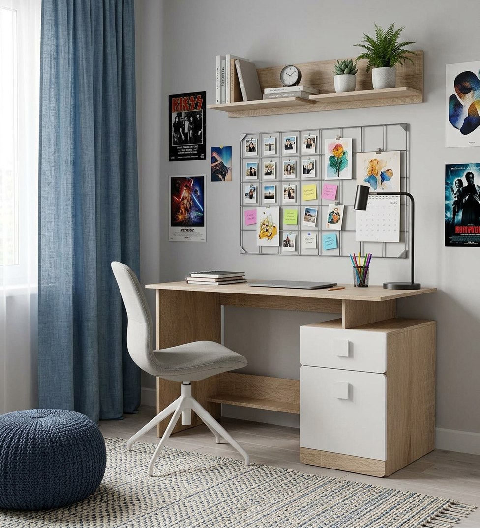 кровать + стол + полка + стеллаж-перегородка для зонирования