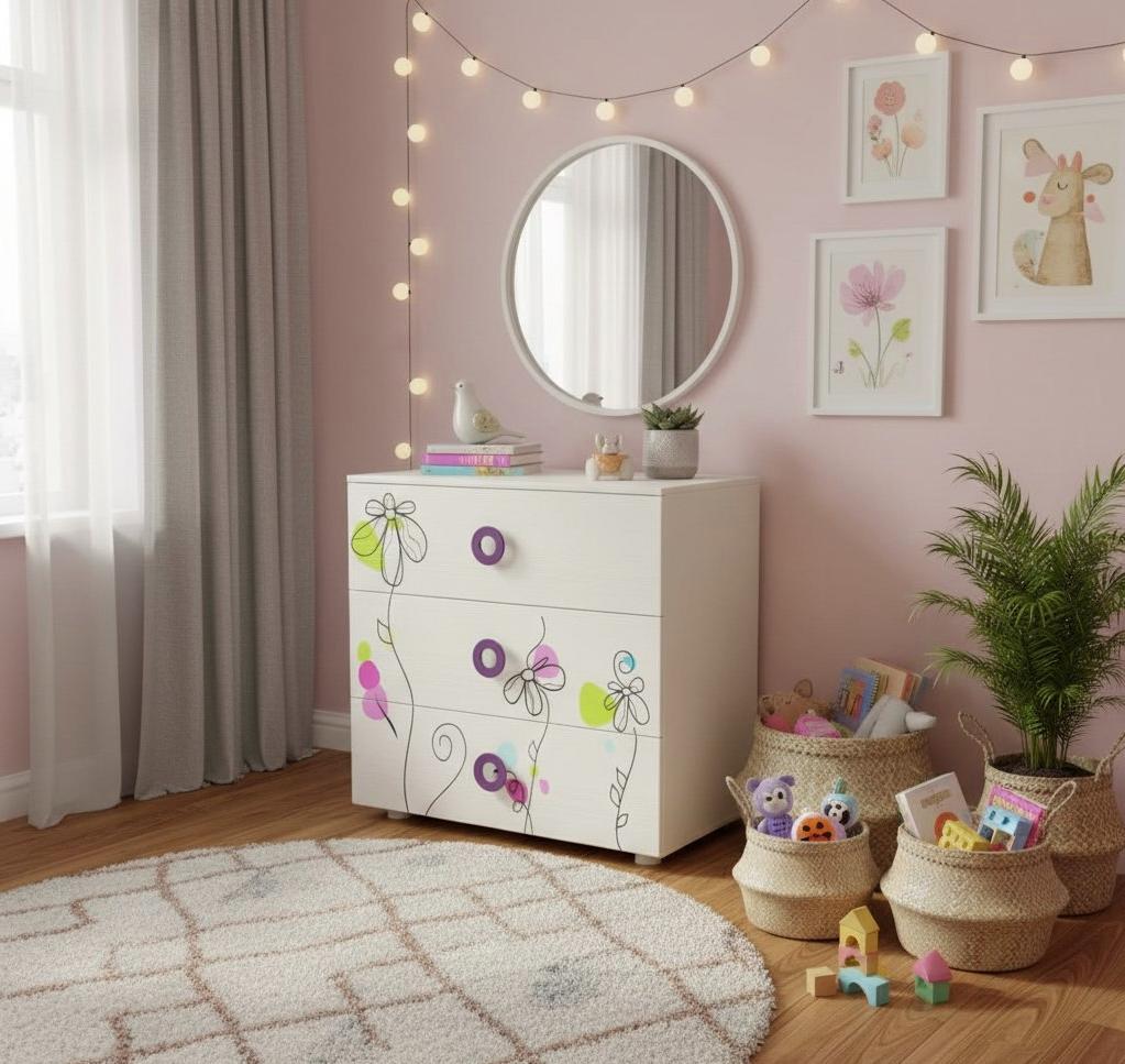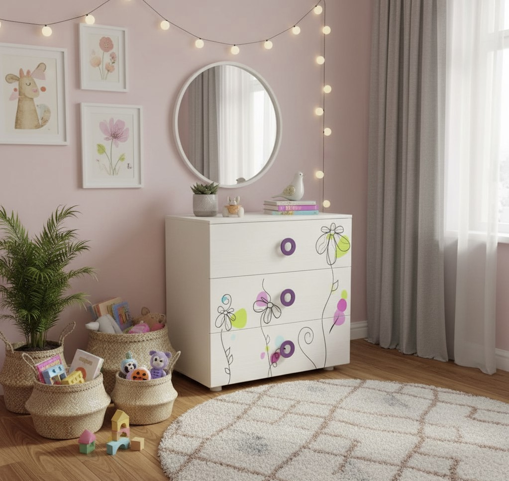Комод выполнен из сертифицированного, качественного, экологически чистого ЛДСП Е0,5 в белом цвете с принтом.