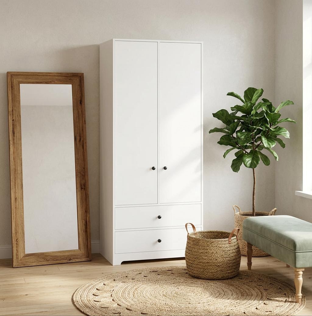 Шкаф поможет максимально грамотно использовать пространство, ведь у него есть два ящика для мелких вещей, штанга, верхние и боковые полки.
