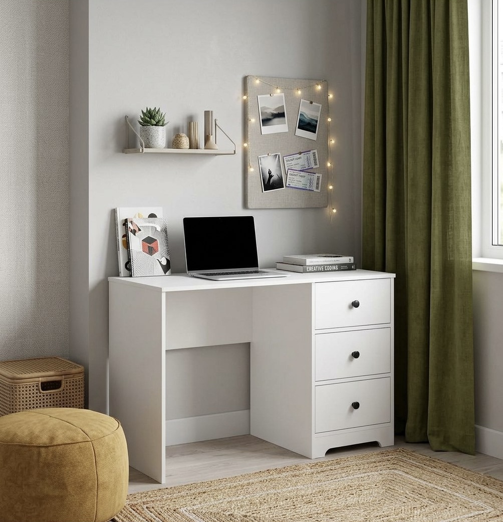 * В стол встроены три выдвижных ящика на направляющих скрытого монтажа с ДОВОДЧИКАМИ.