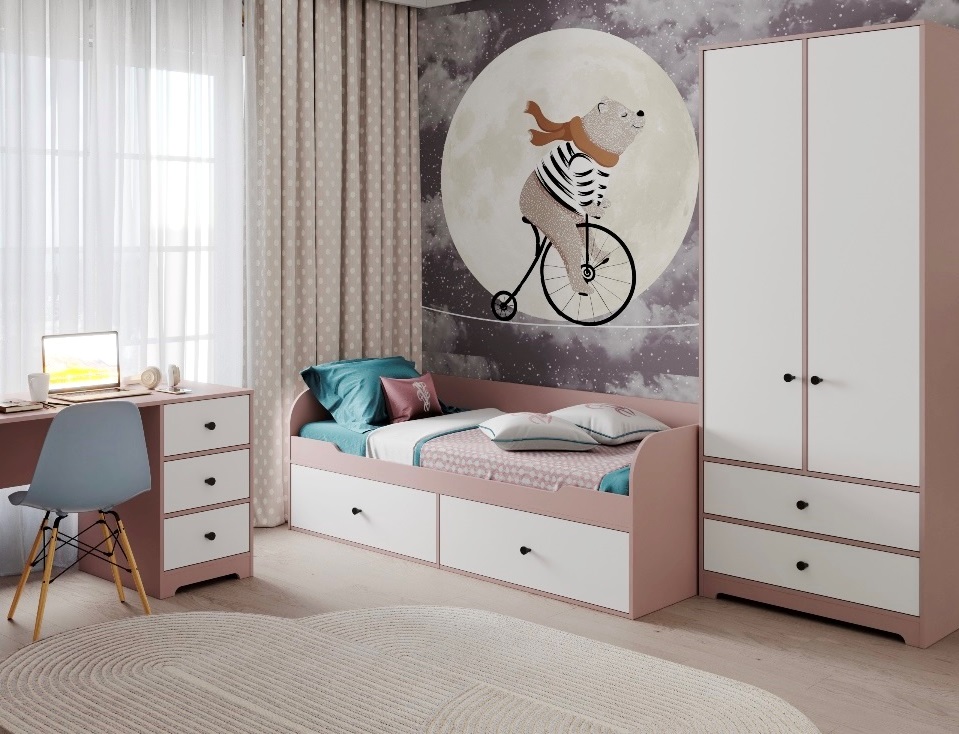 Мебель коллекции Зефир выполнена в трендовом пудровом цвете "бохо" - современное решение для оформления интерьера комнаты девочки. Расширенная гарантия 3 года на мебель и фурнитуру. Рассрочка от банков. Доставка во все города России.