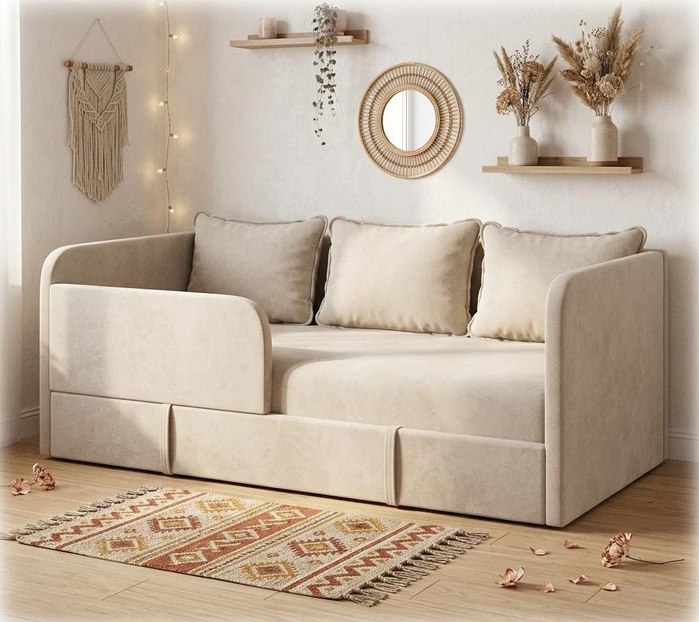 Диванчик подойдет и для самых маленьких деток, так как имеет защитный бортик.