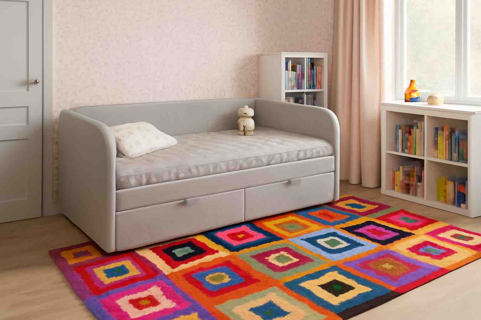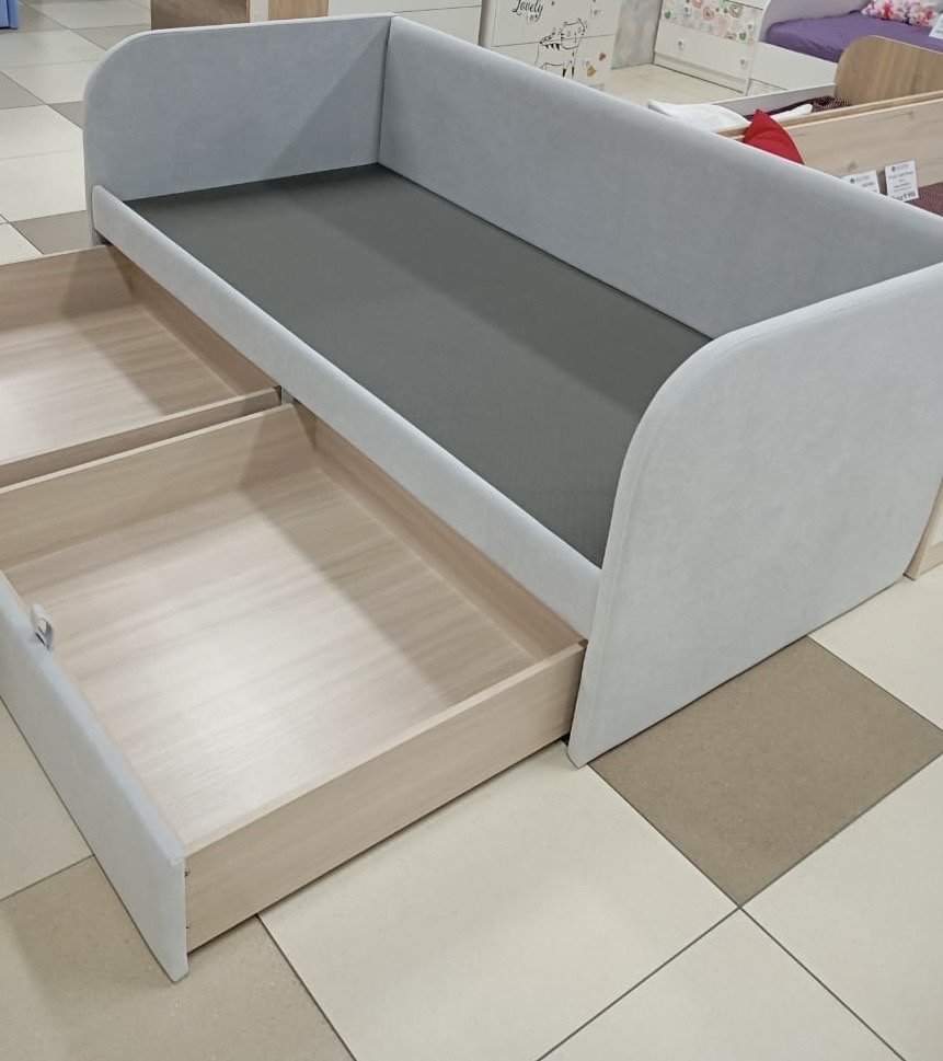 Кровать разработана с учетом требований к безопасности ребенка, сглаженные, мягкие углы, прочная конструкция и безопасные, гипоаллергенные материалы.