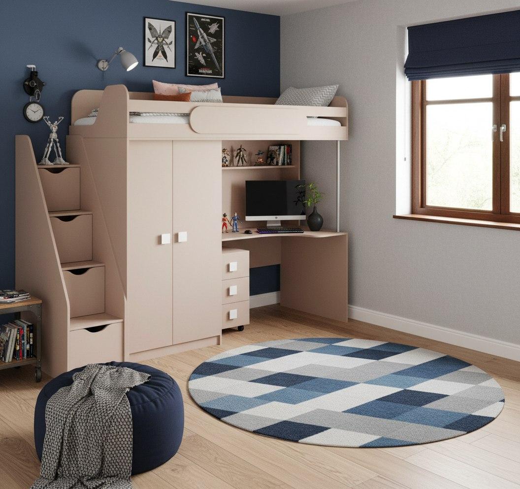 Кровать-чердак с рабочим пространством и шкафом – идеальное решение для детской комнаты.
