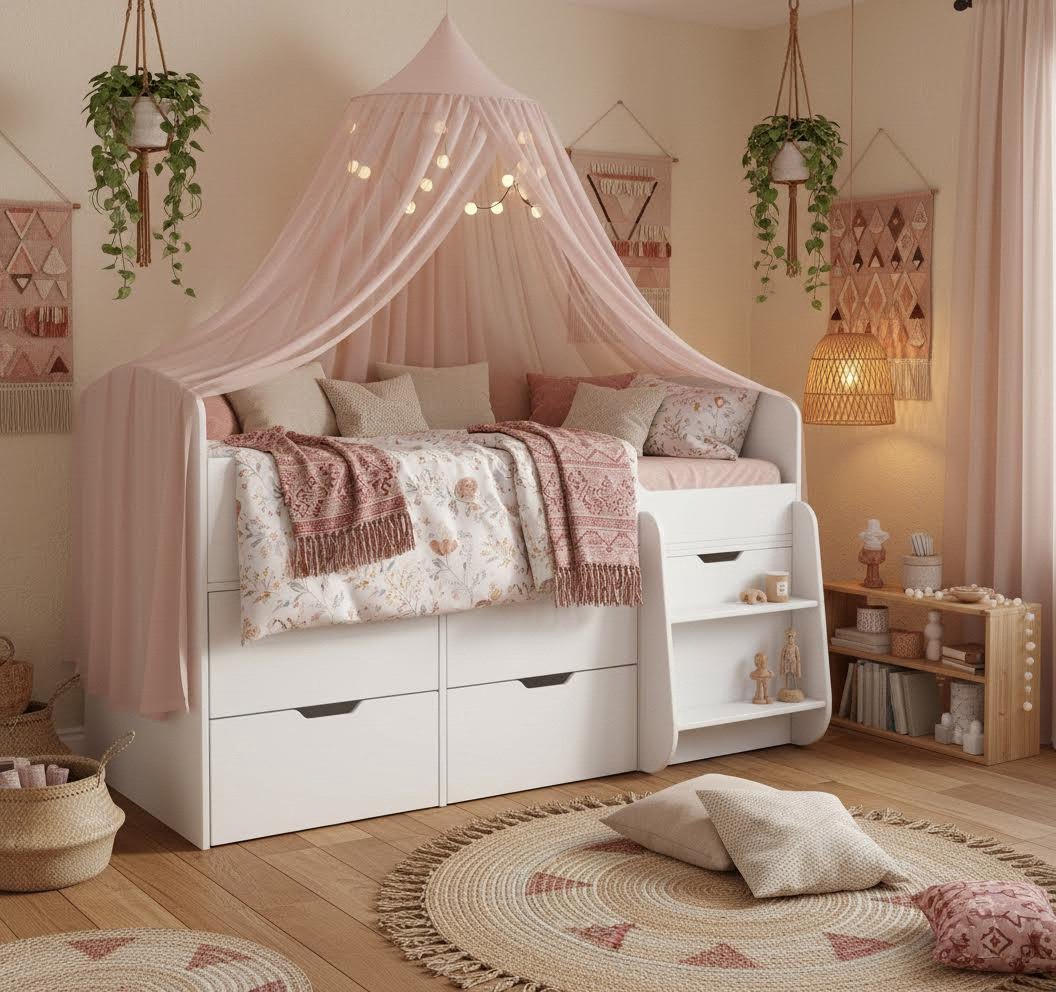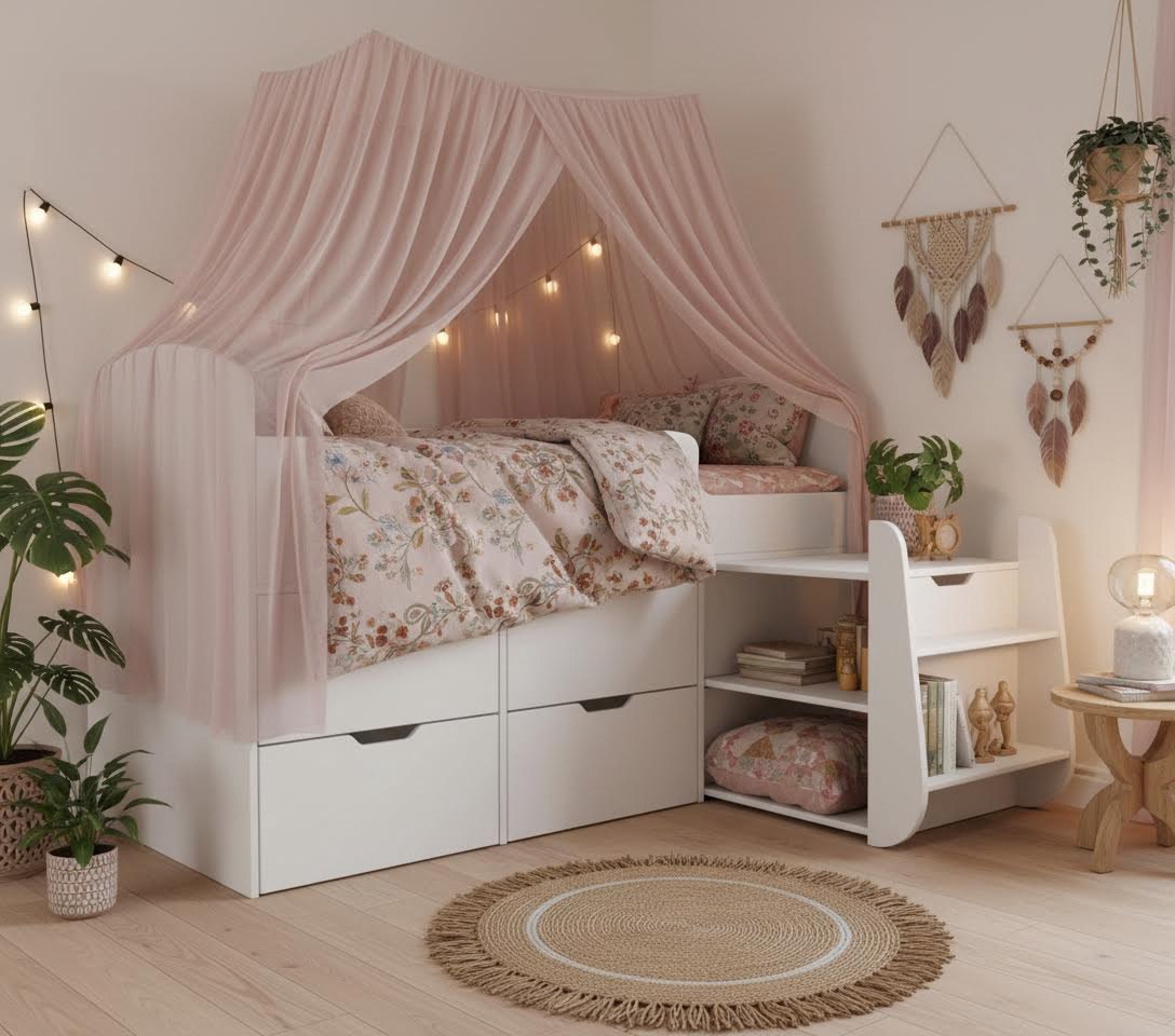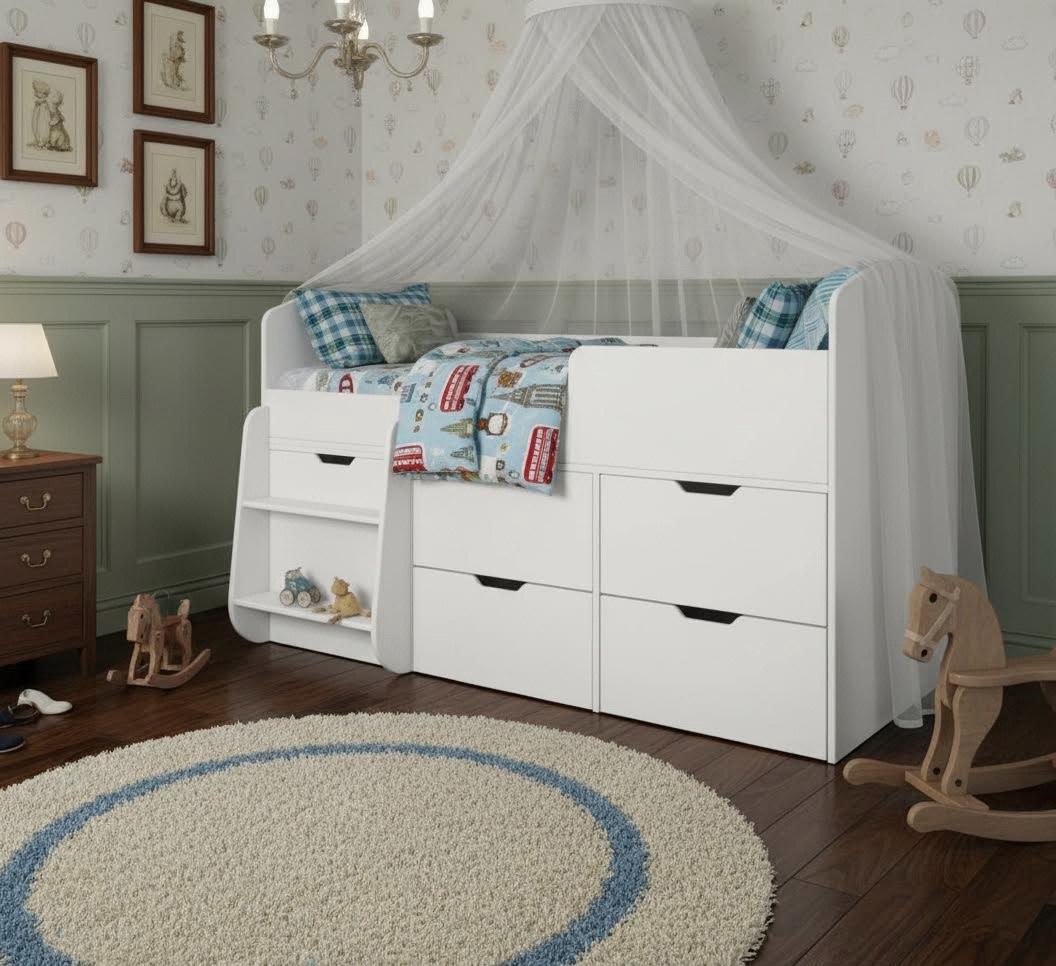 Безопасные бортики, удобная выдвижная лестница с внутренними полочками и небольшая высота кровати сделаны специально для детей младшего возраста.