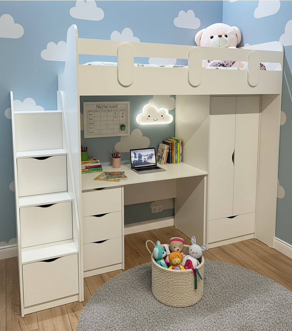 В лестницу встроены выдвижные ящики для игрушек - удобно и практично.