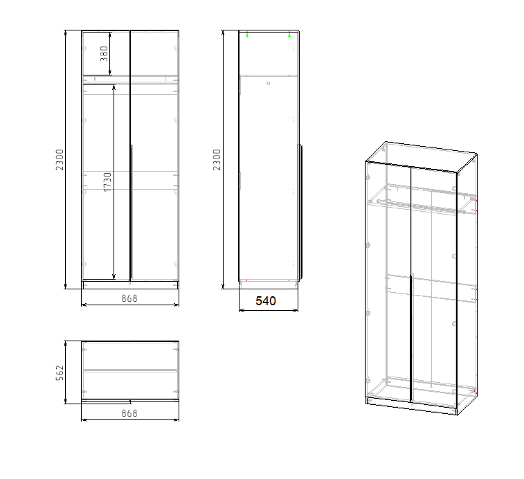 Габариты шкафа: ширина 868, высота 2300, глубина 540 мм (глубина с учетом ручки 562 мм)