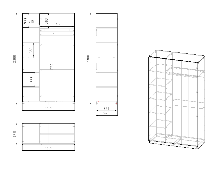 Габариты шкафа: ширина 1301, высота 2300, глубина 540 мм