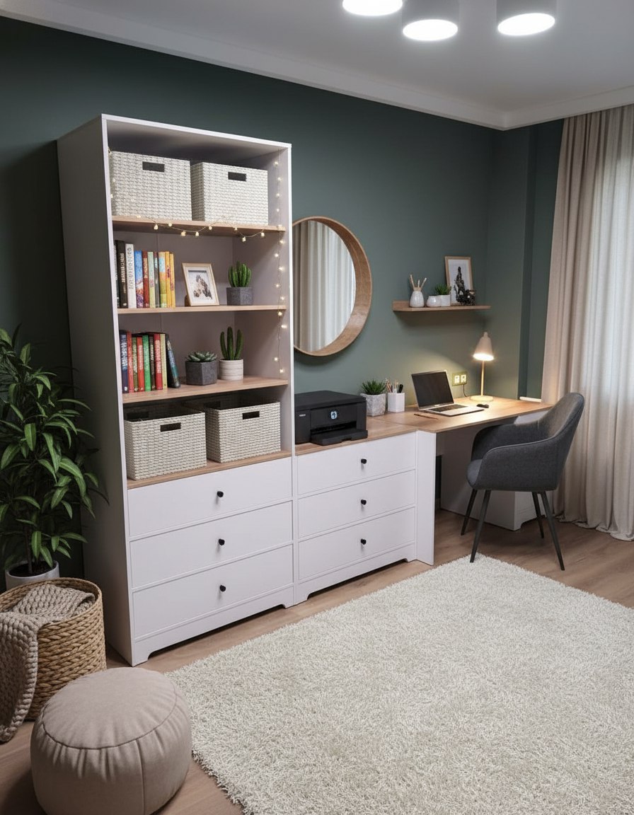 В стеллаж встроены три выдвижных ящика на направляющих скрытого монтажа с ДОВОДЧИКАМИ.