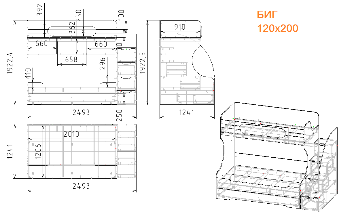 Высокая нагрузка на спальные места. Прочные ящики. Высокий, безопасный бортик! |